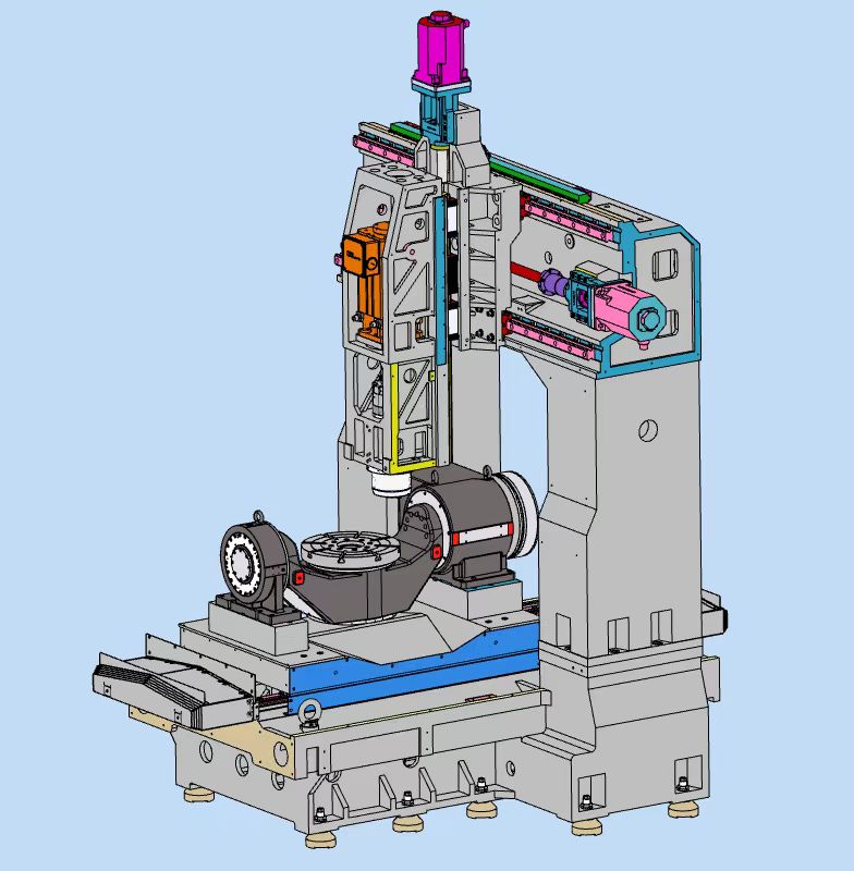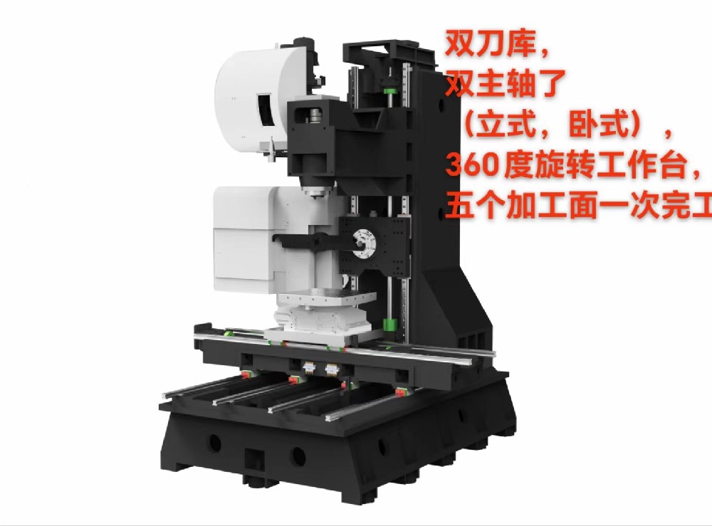 我們根據客戶需求,箱體類(lèi)加工用戶,設(shè)計完成YSLW1160立臥五麵體,需要將工件裝夾多次,才能達到加工多(duō)個麵的(de)工藝,定(dìng)位精度完全靠工裝保證,多(duō)次裝卸,耽誤時間,浪費人力,有時候工件表麵被碰撞等問題,我們這台設備,能夠達(dá)到裝夾一次,五個麵一次性加工完成。臥式主(zhǔ)軸搭配旋轉工作台,解(jiě)決力側麵工藝,立式主軸完(wán)成了另...
